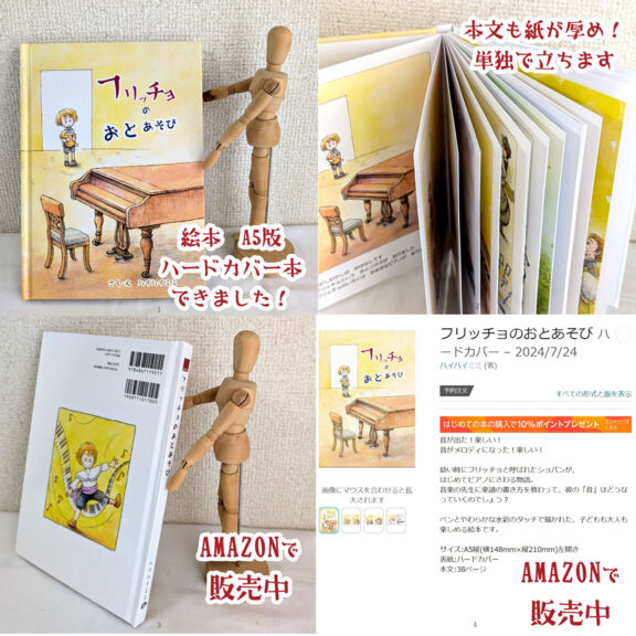 2023.01.13 1,174 ショパン家の子どもたち フリッチョのおはなし ハイハイミミ この絵本を読む アプリで読む お気に入り追加 シェア ポスト この絵本の説明: はじめてピアノにふれ、音であそぶ、 作曲家の子どものころのおはなし。 「フリッチョのおとあそび」として、Amazonで紙版を販売中です。 https://amzn.to/4gDbEgk ページ数: 32 対象年齢: 4歳〜5歳 タグ: かわいい たのしい かぞく ともだち 知育 この絵本について報告する 評価 ログインすると評価ができます ログイン 新規ユーザ登録 感想 ログインすると感想の投稿ができます ログイン 新規ユーザ登録 この作者の他の絵本 ビーム兄ちゃん 6歳〜向け かわいい たのしい かぞく ともだち 知育 メイと牧場のどうぶつたち 4歳〜5歳向け かわいい たのしい 生きもの 知育 自然 作者の絵本一覧 この作者の近況ボード更新履歴 2025.09.18 フリッチョのおとあそび Amazonで、絵本・紙版で販売中です! https://amzn.to/4gDbEgk ハイハイミミ「フリッチョのおとあそび」←題名が若干変更になりました。 小さな男の子が、お母さんの真似をしてピアノの音をひとつ鳴らす。 お姉さんの真似をして、音をもうひとつ鳴らす。 どんどん鳴らしていくと、綺麗な響きを見つけたら…。 もうね、フリッチョはピアノに夢中!! 小さい頃から即興演奏が得意だった、ショパンをイメージした絵本です。 近況ボード一覧